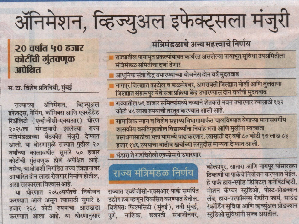 Mumbai, Sep 16 (PTI) The Maharashtra cabinet on Tuesday cleared the new Animation, Visual Effects, Gaming, Comics and Extended Reality (AVGC-XR) Policy 2025 with a roadmap till 2050, projecting the industry to create two lakh jobs and attract Rs 50,000 crore investment over the next 20 years.